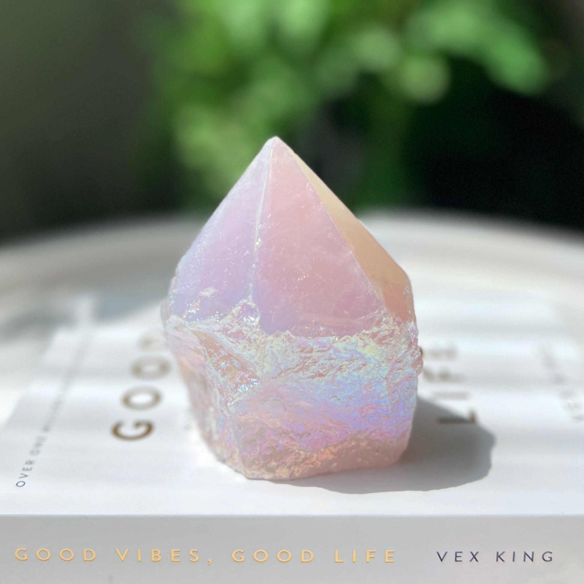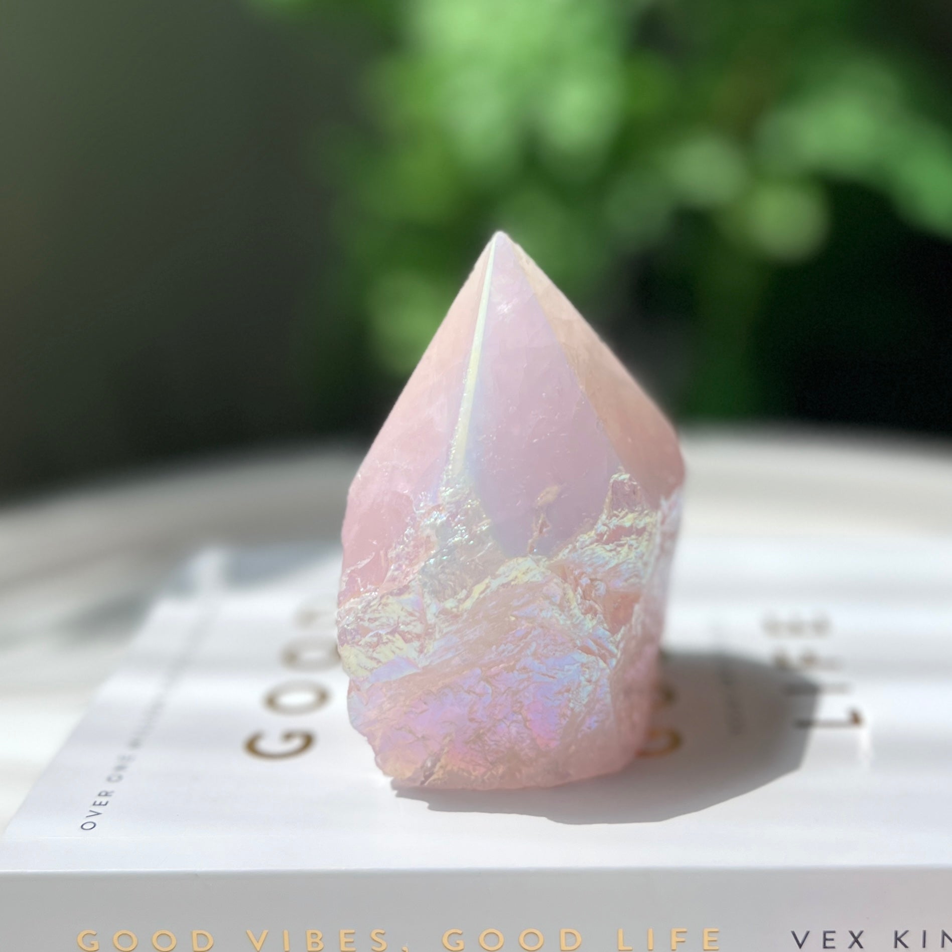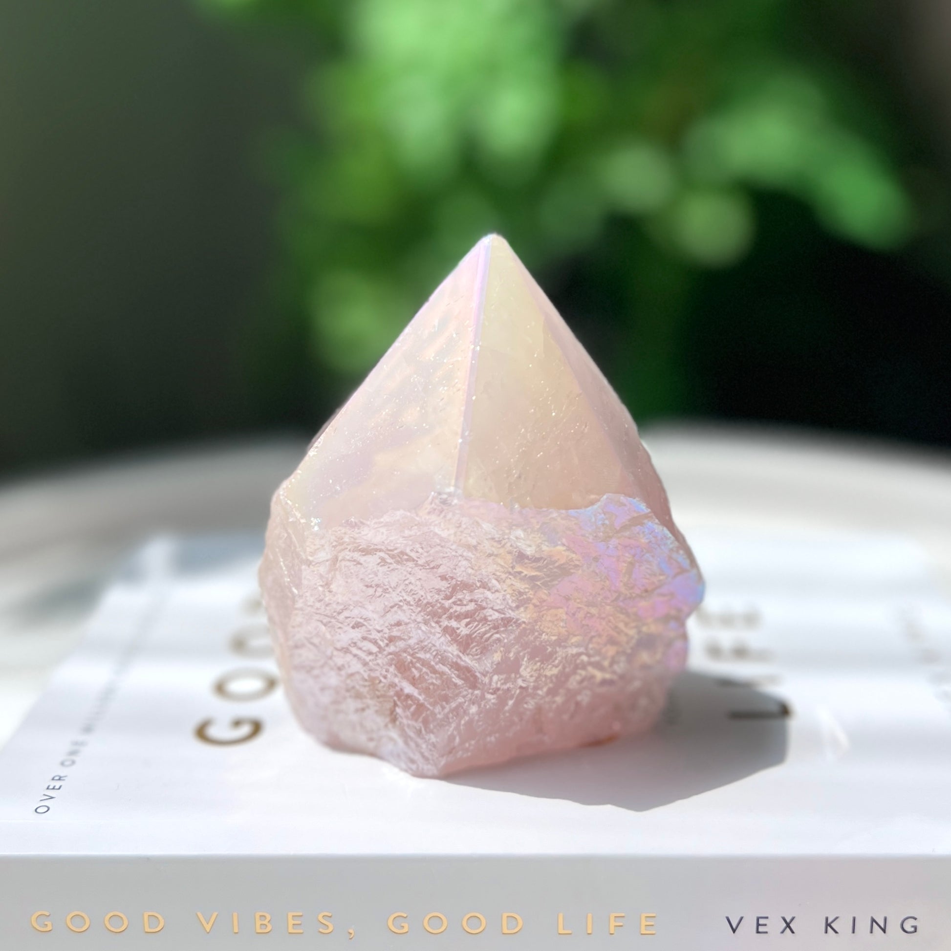 Rose Aura Quartz是天然粉晶,表面的彩光是天然水晶經過極高溫(1600度以上)鉑,銀和金等結合,產生不同的顏色和效應,感覺非常夢幻。