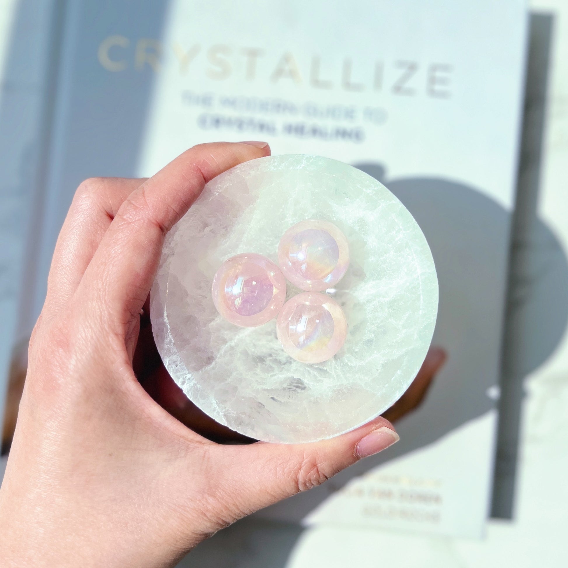 Rose Aura quartz is made with natural beautiful Rose Quartz. Aura Quartz is the name given to Quartz that undergoes extreme heat (1600*F), and then coated with a special blend of metals such as Platinum, Gold, and Silver, to give it the dazzling rainbow shimmer.